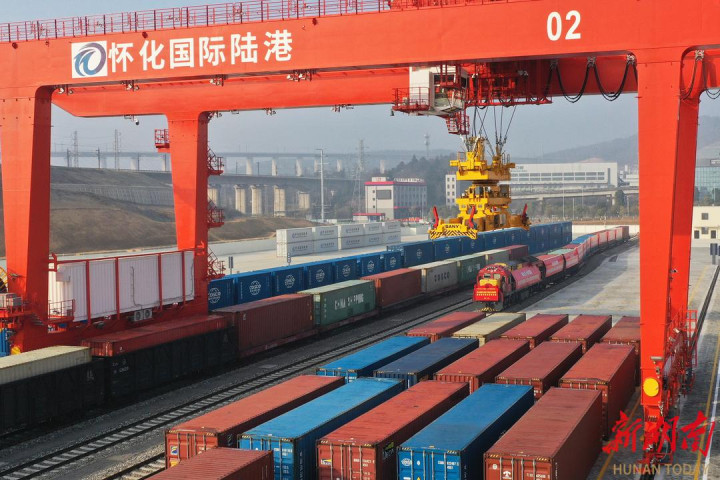2026年1月23日,一列满载货物的班列从怀化国际陆港多式联运中心铁路专用线平稳驶出。柴均林彭雪杨摄影报道(湖南图片库)