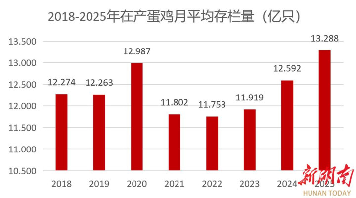 国家蛋鸡产业技术体系的统计数据显示,2025年前9个月蛋鸡月均存栏为13.288亿,成为2018年以来的最高水平。